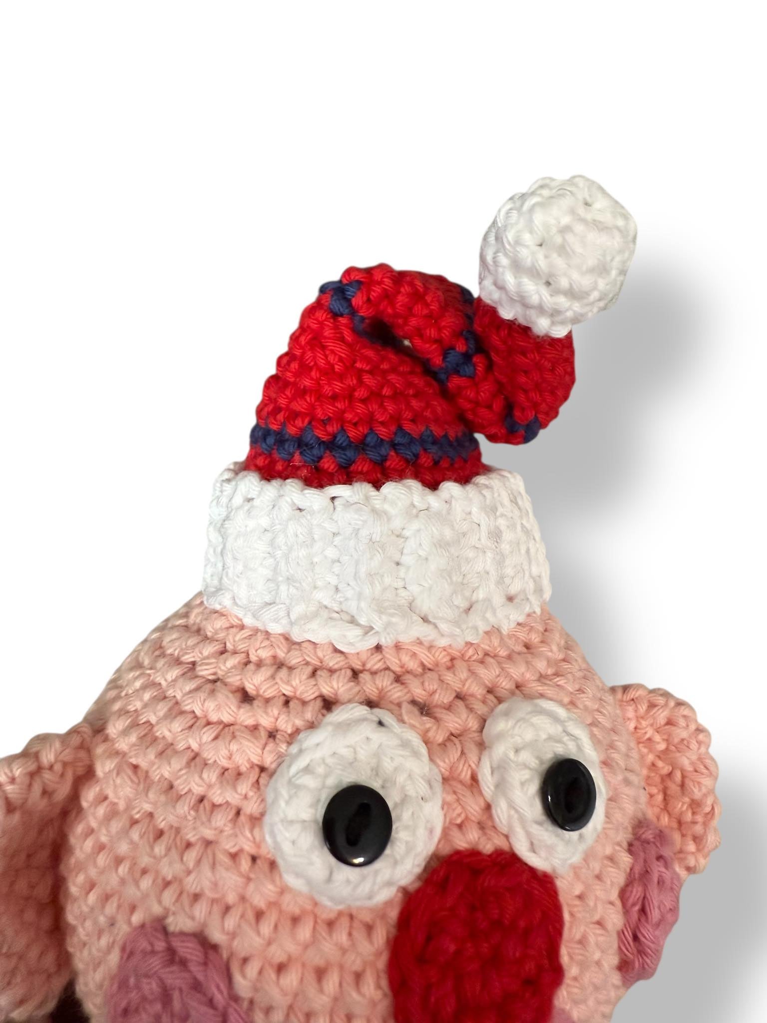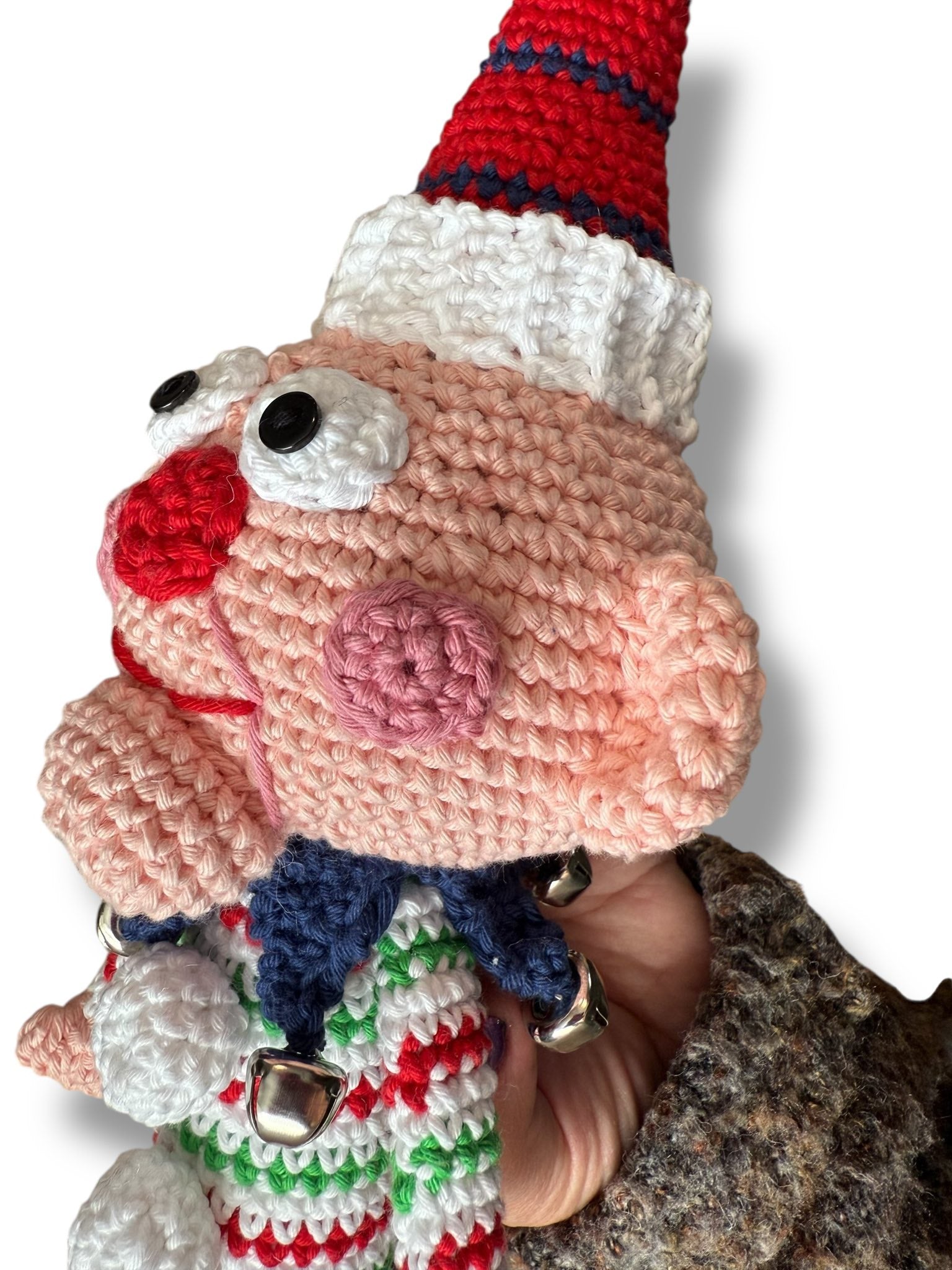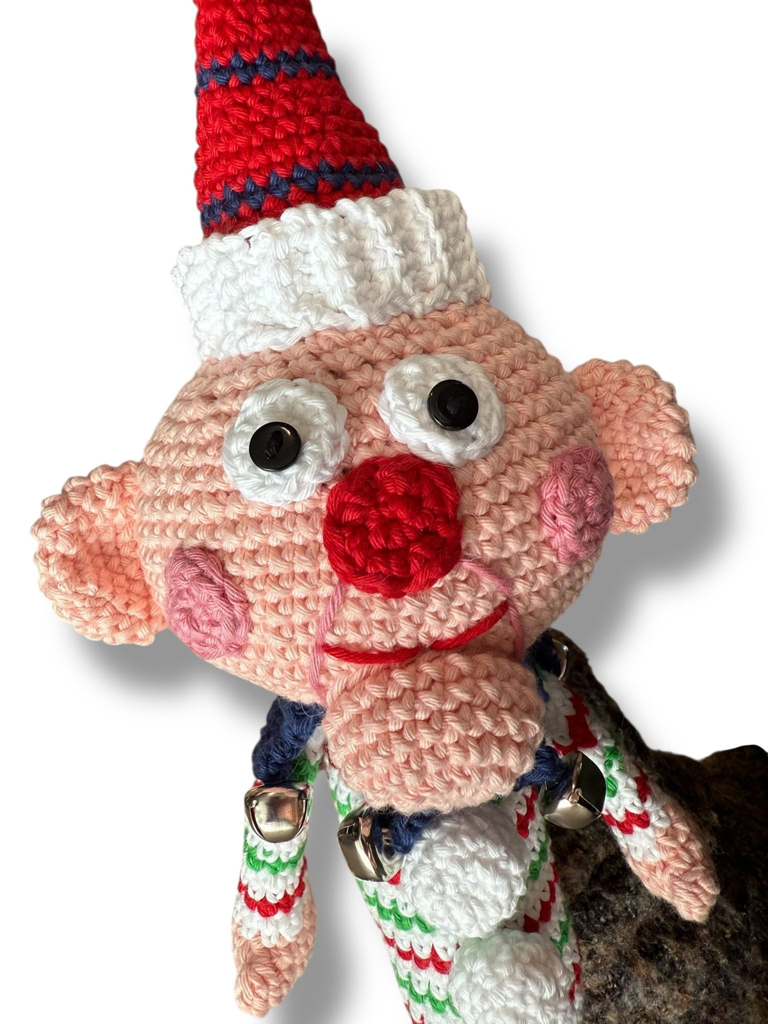 • Arms, pompoms, jingle frill, chin, cheeks, nose, eyes, ears, and hat muff are made separately and sewn on.