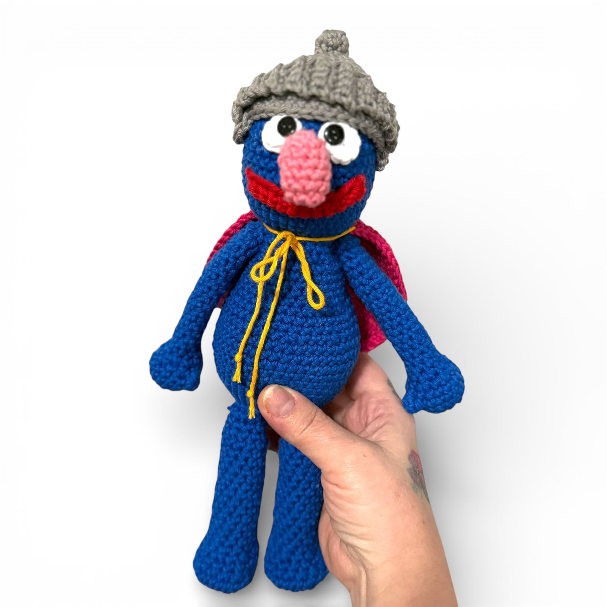 Grover’s body and head are worked in one continuous piece from the bottom up, creating a seamless, polished base. Arms, legs, and eyes are worked separately and sewn on for precise placement and clean finishing.