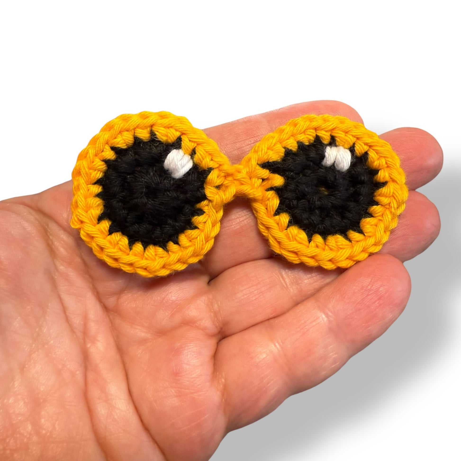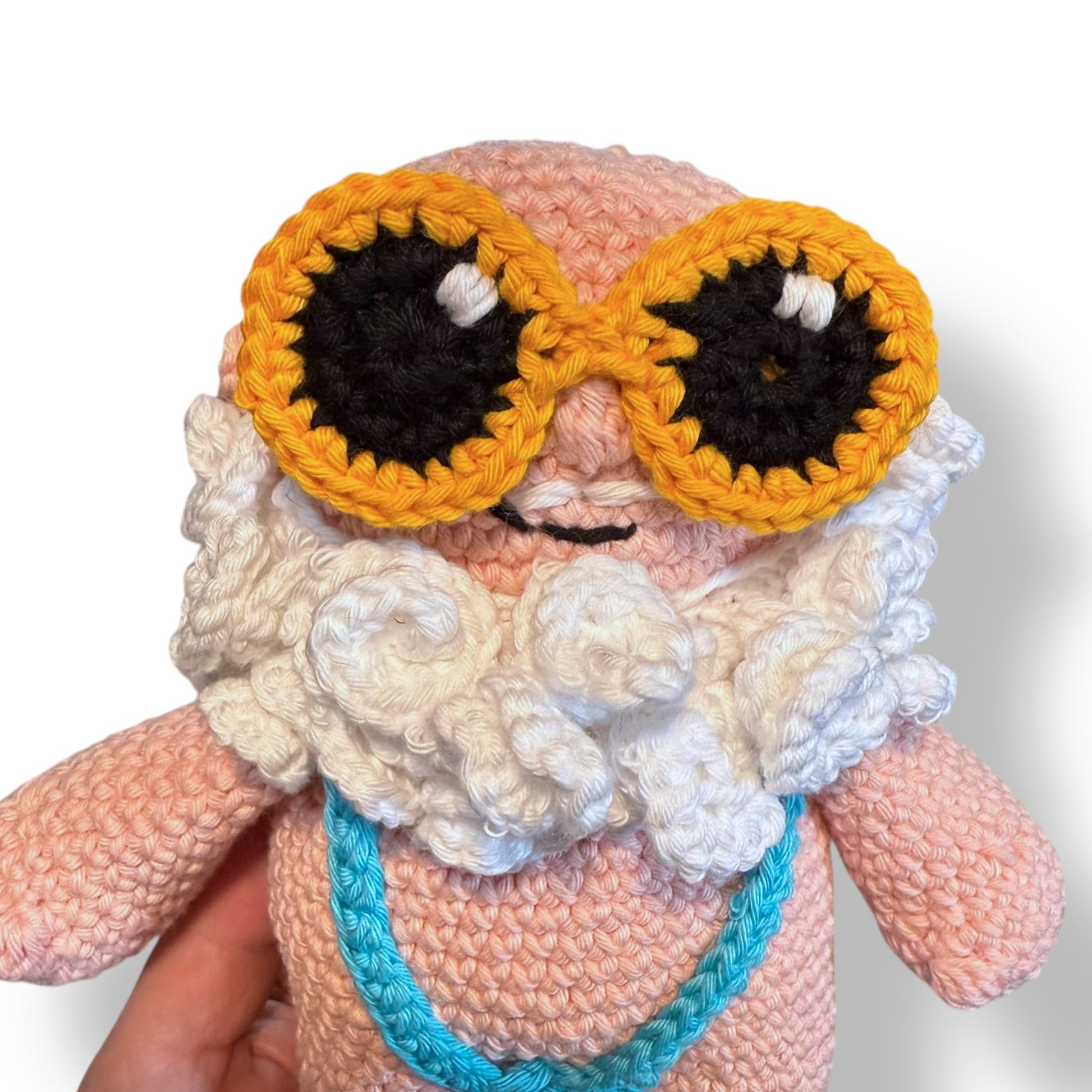 - Arms, mankini, beard, ears, hat, and sunglasses are worked separately and sewn on
