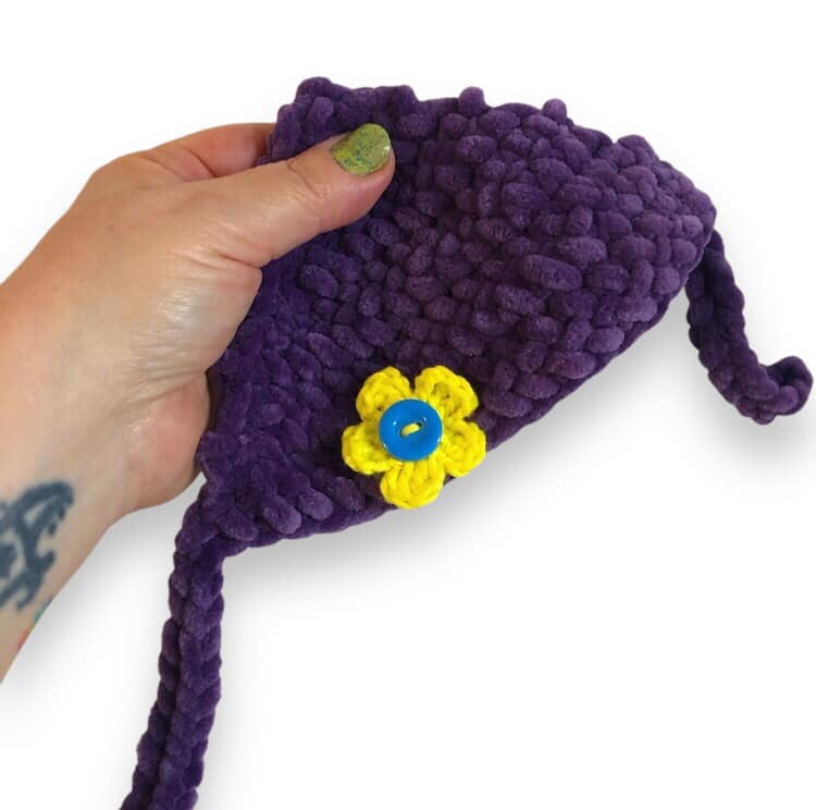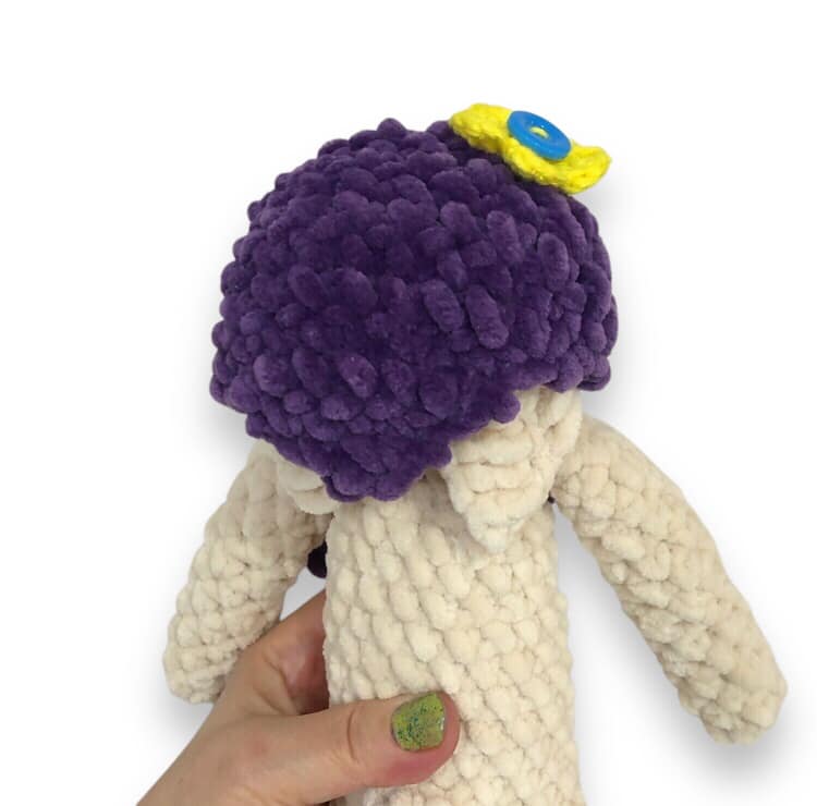 - The babushka’s flower is made separately with a smaller hook and sewn on for extra charm.