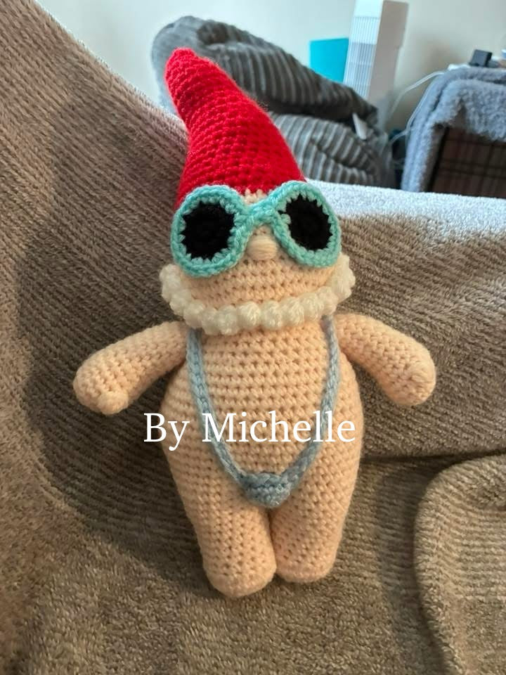 - Arms, mankini, beard, and sunglasses are made separately and sewn on.