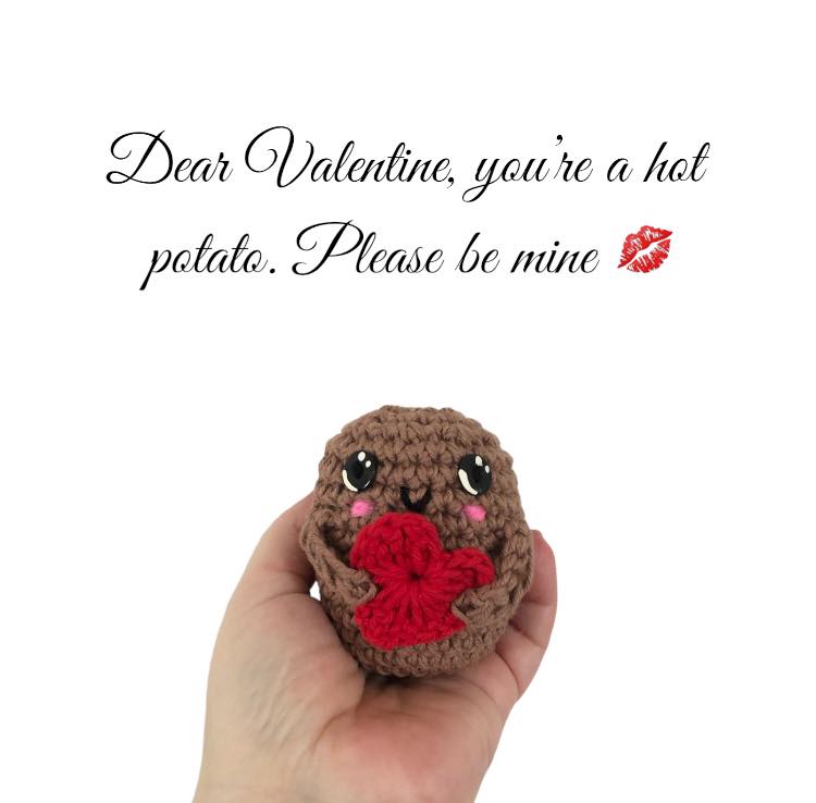 This crochet pattern is for the sweetest little emotional support potato. He's got a warm little heart, just for you. You can even crochet these little taters up quickly and hand them out to your friends. What a great way to say you care!