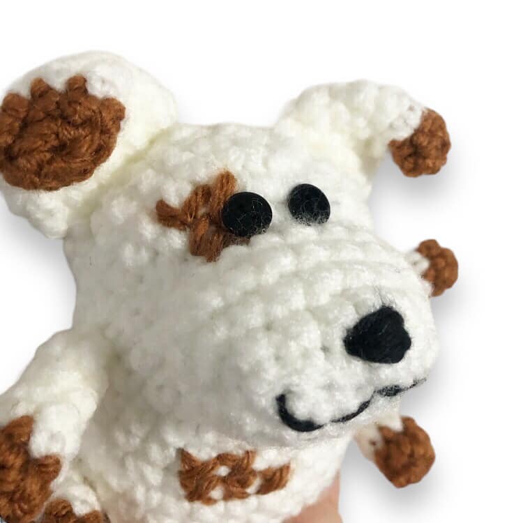 - Limbs, ears, tail, and muzzle are worked separately and sewn on.