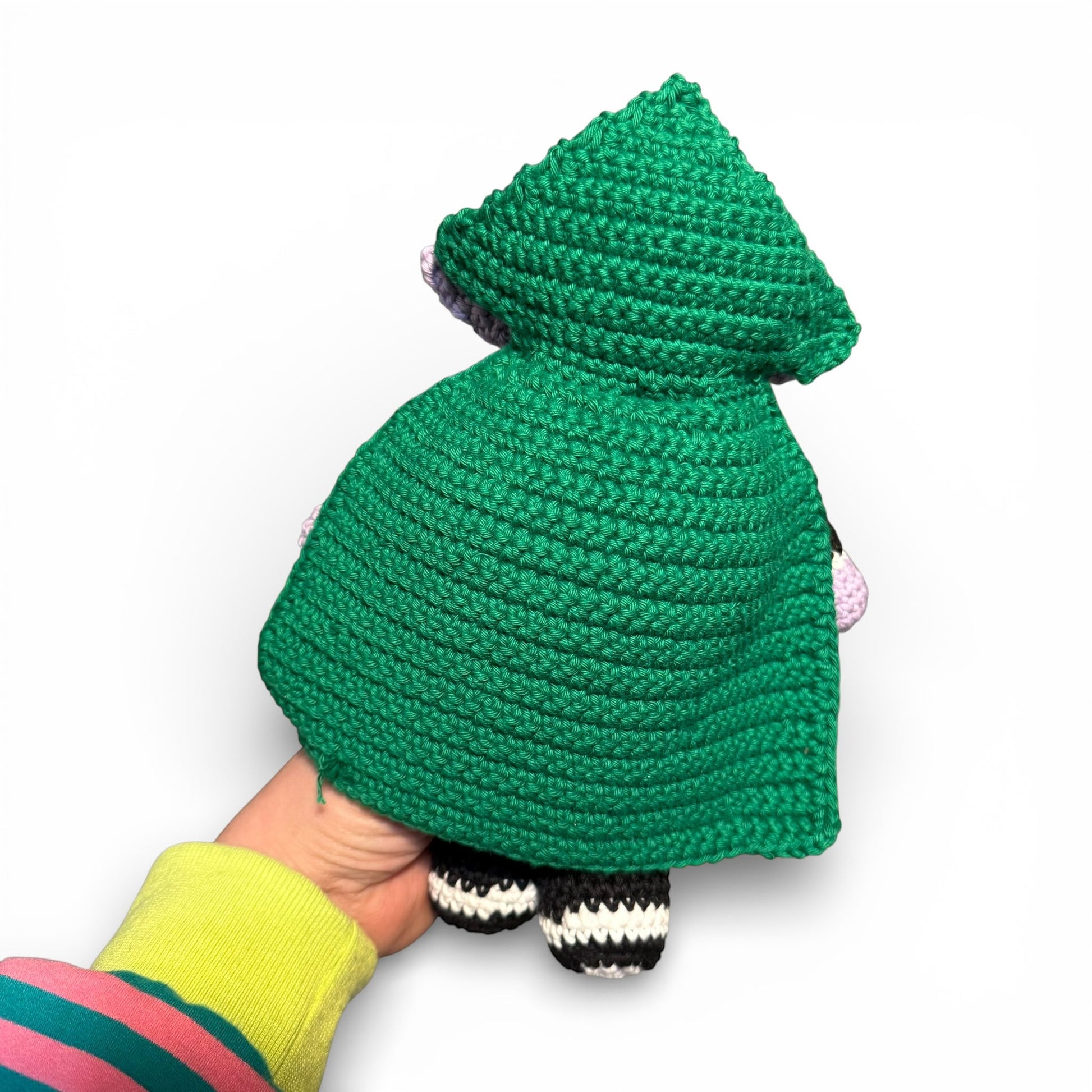 - Arms, sash, legs, jacket, nose, ears, hair, and cape are worked separately and sewn on.